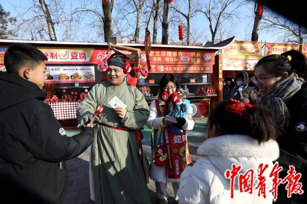 1月29日,农历正月初一,北京,第三十九届龙潭春节文化庙会,一名年轻人身着古装向游客介绍他们的文创产品。庙会上,各种融合传统与现代的文创产品、别具特色的非遗文化产品受到市民和游客的欢迎。中青报·中青网记者 李建泉/摄
