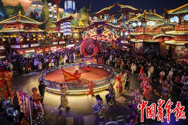 2月2日,山东青岛,游客在明月·山海间景区里观看来自广东揭阳惠来县隆江镇的英歌舞表演。英歌舞是一种流行于广东汕头、潮州、揭阳、汕尾及福建漳州等地区的民间广场舞蹈,2006年被列入第一批国家级非物质文化遗产代表性项目名录,近年来受到全国多地观众的喜爱。中青报·中青网记者 孔斯琪/摄