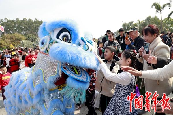 1月29日,农历正月初一,广西壮族自治区南宁园博园清泉湖广场,游人围观梅花桩醒狮表演,在互动环节,大家纷纷伸手抚摸狮子头,寓意新的一年鸿运当头。 据统计,1月29日南宁多个景区入园游客量创新高。中青报·中青网记者 谢洋/摄