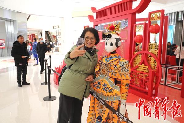 1月30日,北京五棵松万达广场,2025海淀新春科技庙会上,一名女士正在和一个京剧扮相的机器人合影留念。近年来,机器人制造业在我国呈现出迅猛的发展势头,越来越多的机器人出现在车间、展台,甚至人们家中。今年央视春晚上机器人秧歌队的表演,引发人们的热议。中青报·中青网记者 陈剑/摄