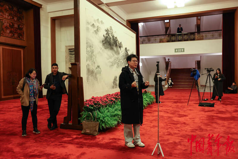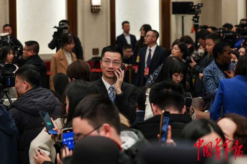 3月3日下午,北京,人民大会堂一层,全国政协十四届三次会议新闻发布会间隙,记者在新闻发布厅外持续报道。中青报·中青网记者 曲俊燕/摄