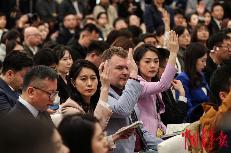 3月3日下午,北京,人民大会堂一层新闻发布厅,全国政协十四届三次会议新闻发布会上,中外记者纷纷举手,准备向全国政协大会新闻发言人刘结一提问。中青报·中青网记者 曲俊燕/摄