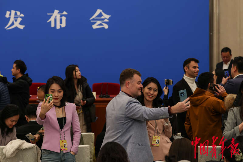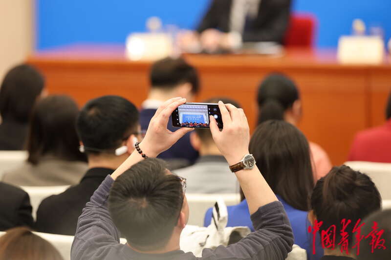 3月3日下午,北京,全国政协十四届三次会议新闻发布会在人民大会堂一层新闻发布厅举行,记者用手机拍摄大会新闻发言人刘结一答记者问。中青报·中青网记者 曲俊燕/摄