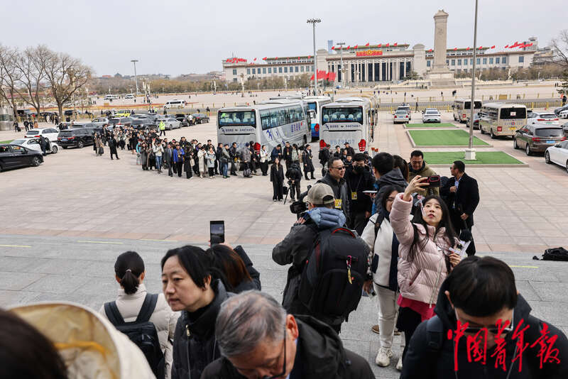 3月3日下午,北京,人民大会堂东门外,全国政协十四届三次会议新闻发布会开始前,记者排队等待入场。中青报·中青网记者 曲俊燕/摄