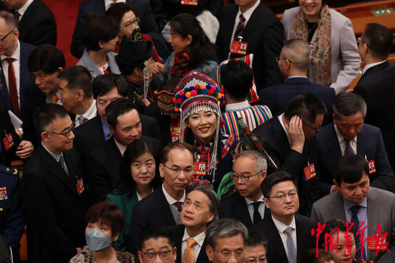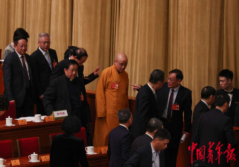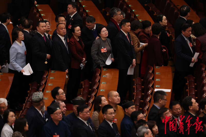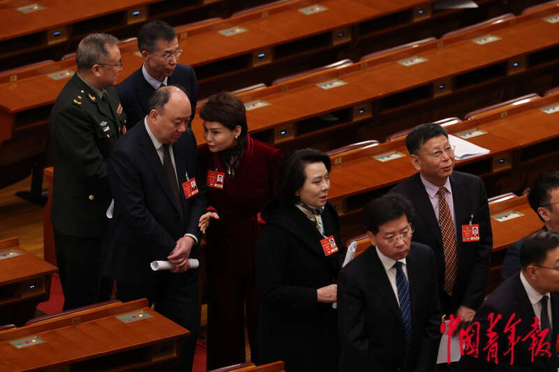 3月4日,北京,人民大会堂,全国政协十四届三次会议开幕会结束后,委员们在离场时相互交流。中青报·中青网记者 曲俊燕/摄