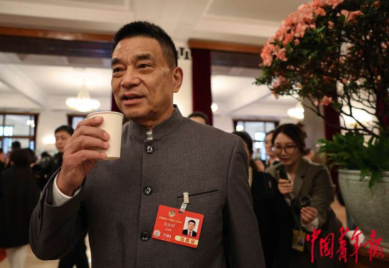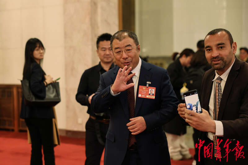 3月4日,北京,人民大会堂,全国政协十四届三次会议开幕会开始前,全国政协委员、北京人民艺术剧院院长冯远征被记者围住采访。中青报·中青网记者 曲俊燕/摄
