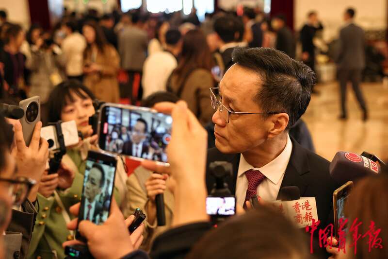 3月4日,北京,人民大会堂,全国政协十四届三次会议开幕会结束后,外媒记者追着全国政协委员、全国工商联副主席、奇安信科技集团董事长齐向东进行采访。两会前夕,齐向东曾在采访中表示,他将在今年全国两会上关注人工智能安全和软件产业健康发展问题。中青报·中青网记者 曲俊燕/摄