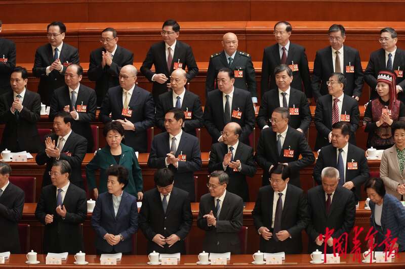 3月5日,北京,人民大会堂,第十四届全国人民代表大会第三次会议开幕会开始前,主席台上代表起立欢迎。中青报·中青网记者 李隽辉/摄