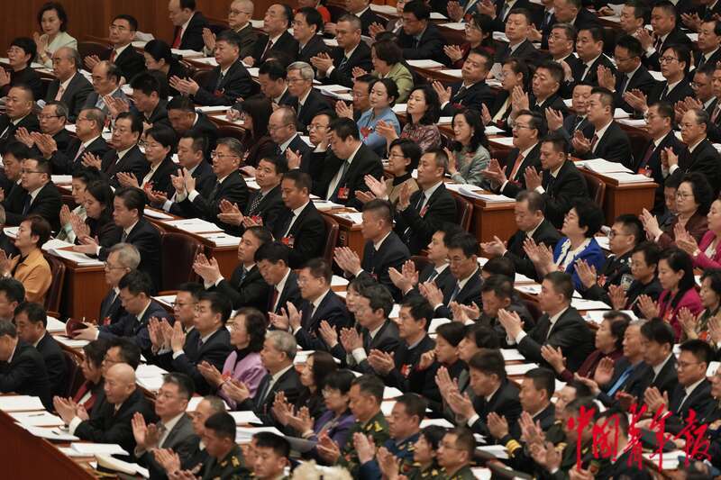 3月5日,北京,人民大会堂,第十四届全国人民代表大会第三次会议开幕会上,国务院总理李强作政府工作报告,台下代表鼓掌。中青报·中青网记者 李隽辉/摄