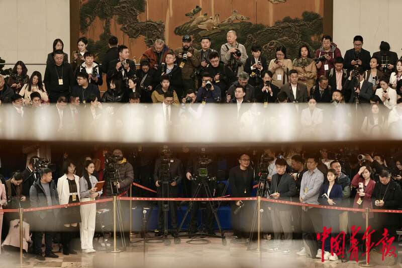 3月5日,北京,人民大会堂,第十四届全国人民代表大会第三次会议即将开幕,记者们等待“代表通道”开始。中青报·中青网记者 李隽辉/摄