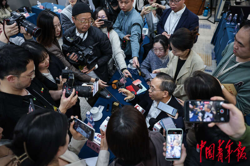 3月5日,北京铁道大厦,全国政协十四届三次会议经济界别小组会议上,记者们在委员身后拍摄。中青报·中青网记者 曲俊燕/摄