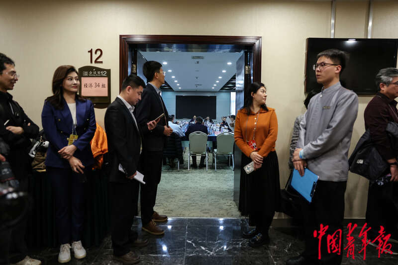 3月5日,北京铁道大厦,全国政协十四届三次会议经济界别小组会议开始前,部分委员已经就坐,记者和工作人员在门口等待入场。经济界别小组会议备受瞩目,会议开始前两个多小时,便有记者在会场外排队等候。中青报·中青网记者 曲俊燕/摄