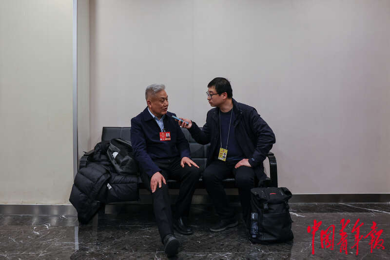 3月5日,北京铁道大厦,全国政协十四届三次会议经济界别当天的小组会议结束后,一名记者在会场外的安静角落采访全国政协委员、申万宏源证券研究所首席经济学家杨成长(左)。中青报·中青网记者 曲俊燕/摄