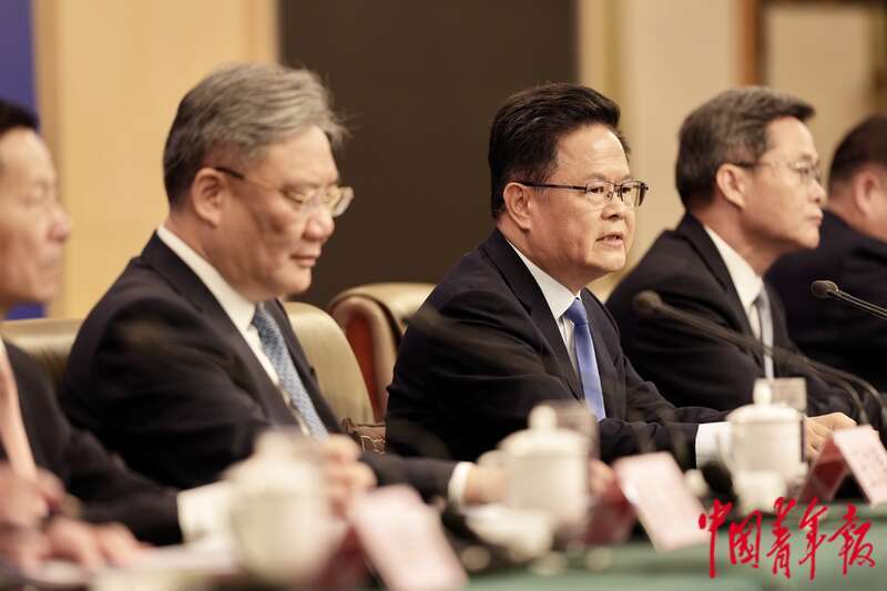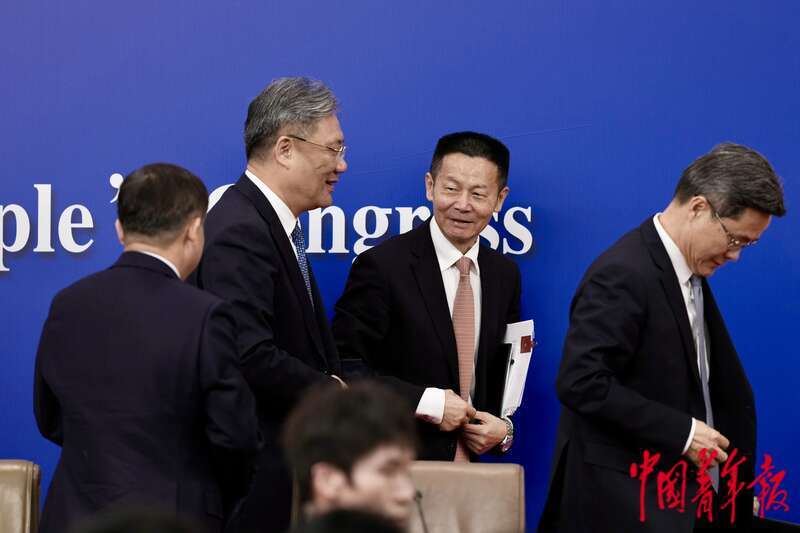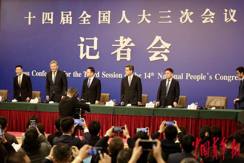3月6日下午,北京,梅地亚中心新闻发布厅,十四届全国人大三次会议举行记者会,国家发展和改革委员会主任郑栅洁、财政部部长蓝佛安、商务部部长王文涛、中国人民银行行长潘功胜、中国证券监督管理委员会主席吴清走进会场,准备就发展改革、财政预算、商务、金融证券等相关问题回答中外记者提问。中青报·中青网记者 李隽辉/摄
