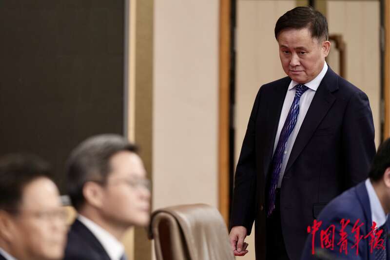 3月6日下午,北京,梅地亚中心新闻发布厅,十四届全国人大三次会议经济主题记者会上,中国人民银行行长潘功胜短暂离席后回到座位。潘功胜表示,强化预期引导,坚决防范汇率超调风险。中青报·中青网记者 李隽辉/摄中青报·中青网记者 李隽辉/摄