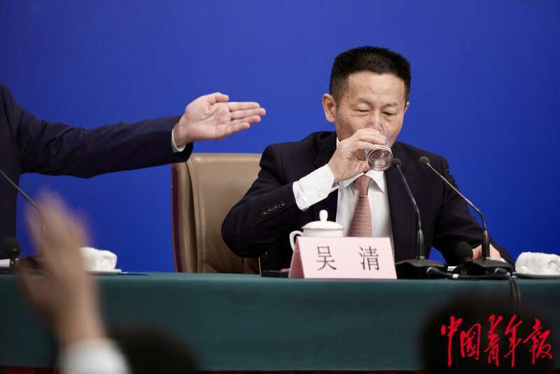 3月6日下午,北京,梅地亚中心新闻发布厅,十四届全国人大三次会议经济主题记者会上,中国证券监督管理委员会主席吴清在回答完DeepSeek相关问题后喝水。他笑称“经济主题记者会快变成科技主题记者会”。中青报·中青网记者 李隽辉/摄