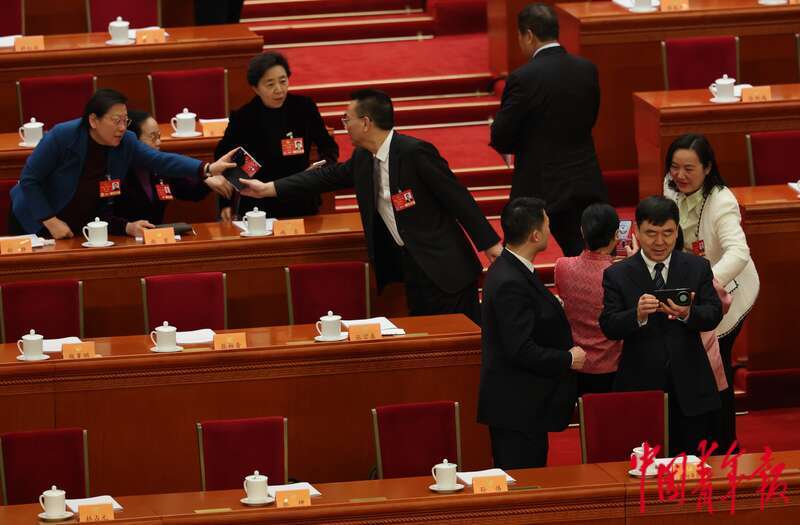 3月9日上午,北京人民大会堂,全国政协十四届三次会议第三次全体会议结束后,委员们互相交流。中青报·中青网记者 曲俊燕/摄