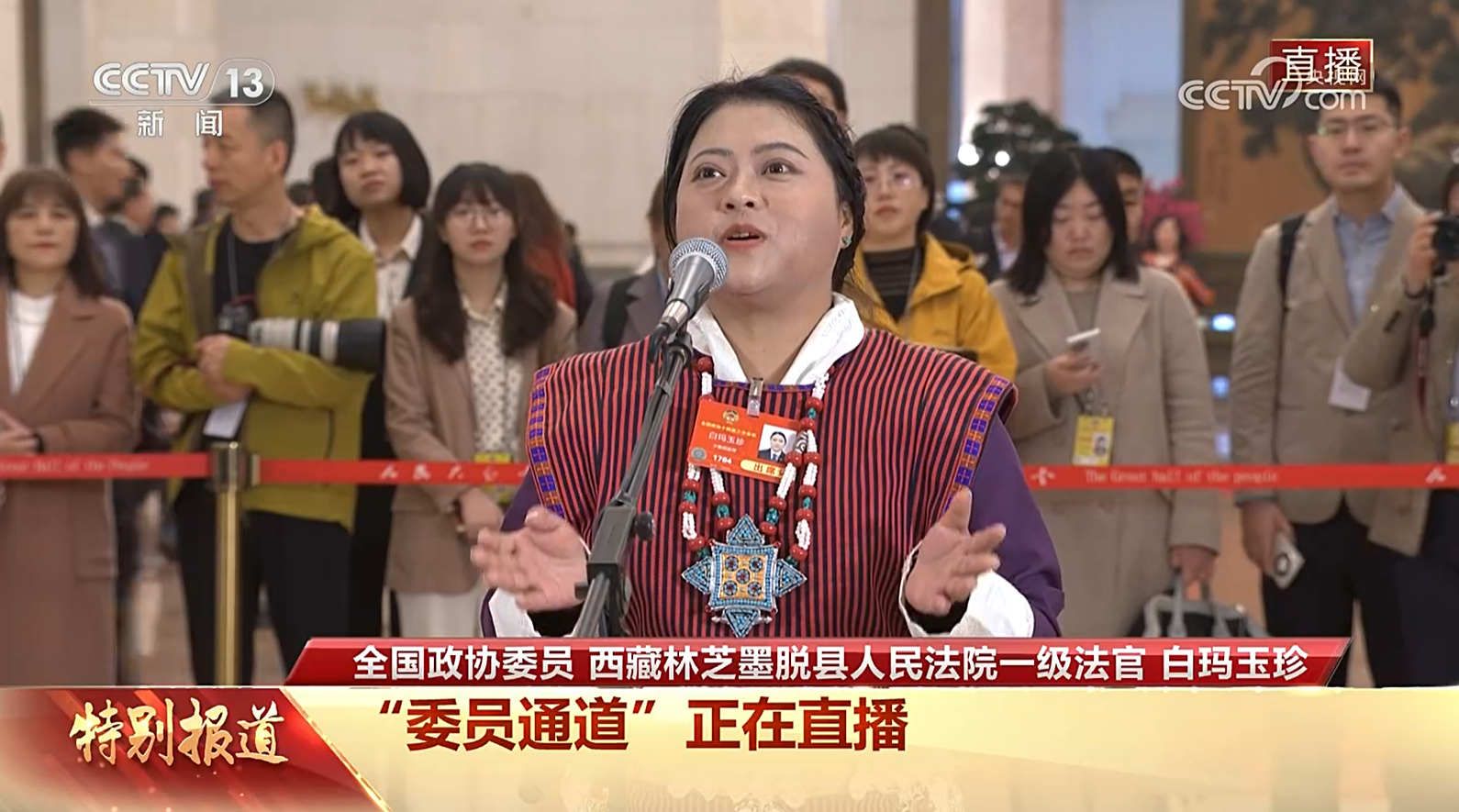 中国青年报客户端北京3月10日电(中青报·中青网记者 沈杰群)今天,在全国政协十四届三次会议的第三场“委员通道”上,全国政协委员、西藏林芝墨脱县人民法院一级法官白玛玉珍为家乡打call:“墨脱实现了高原孤岛向美丽边城的时代蜕变。”