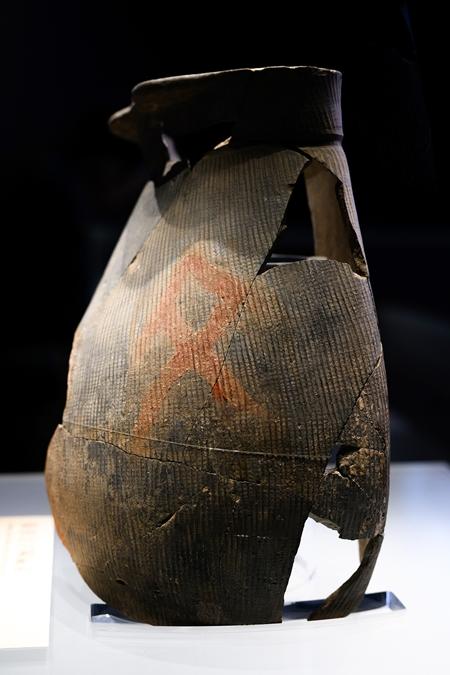 陶寺遗址出土的朱书扁壶,上有疑似文字的符号。视觉中国供图