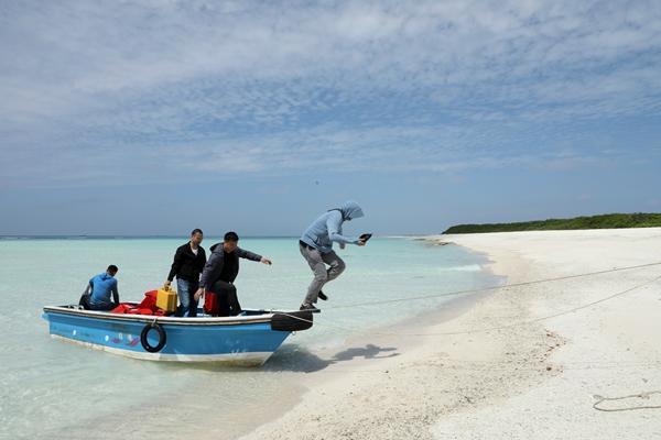 三沙文物普查工作队队员乘坐小艇登上岛礁。受访者供图