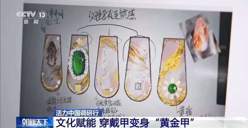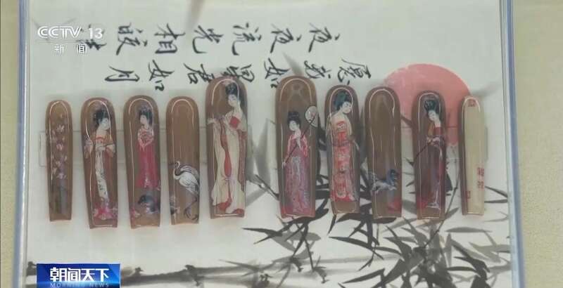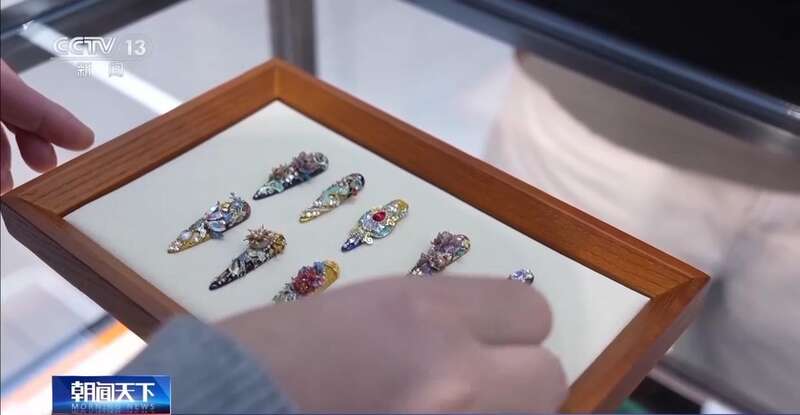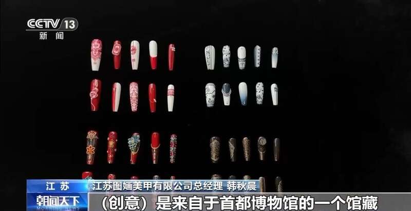 江苏图婳美甲有限公司总经理 韩秋晨:这套产品是文旅路线的穿戴甲,创意来自首都博物馆的一个馆藏。海外的经销商也给我们一个反馈,带着中国元素,包括传统文化的穿戴甲销售情况越来越好了。