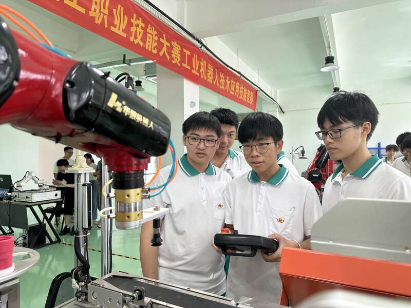 6月28日,广东省佛山市,在佛山市华数智造公共实训中心,参加工业机器人技术相关竞赛的学生们正在进行机器人实训操作。中青报·中青网记者 林洁/摄