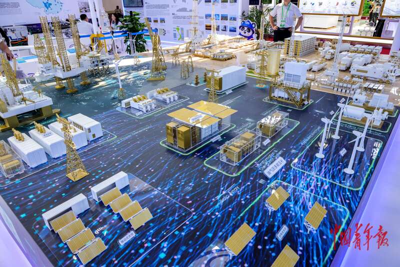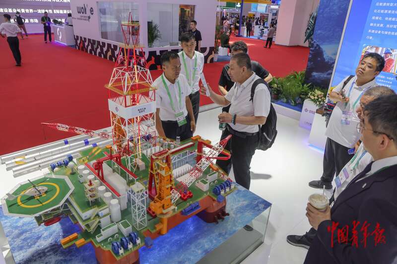 7月17日,北京,中国国际展览中心(顺义馆),第三届链博会清洁能源链展区,在中国海油展台上,工作人员为观众讲解我国自主设计、建造的第一艘第六代超深水动力定位钻井平台“奋进号”。陈思阳/摄