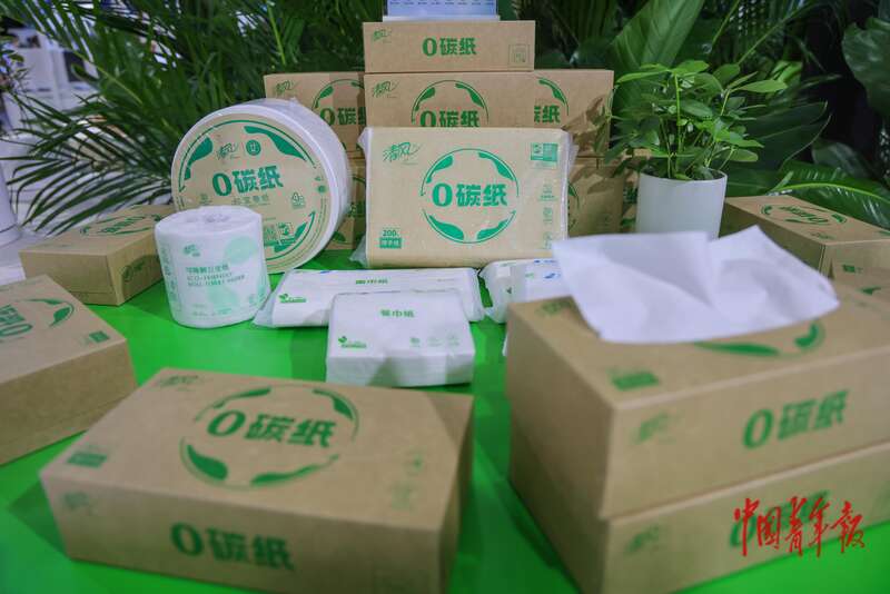 7月17日,北京,中国国际展览中心(顺义馆),第三届链博会先进制造链展区,在一家印尼华侨企业展位上展示的0碳纸巾。据介绍,该纸巾使用原生木浆,可降解,每使用1包纸巾约抵消465克碳排放。陈思阳/摄