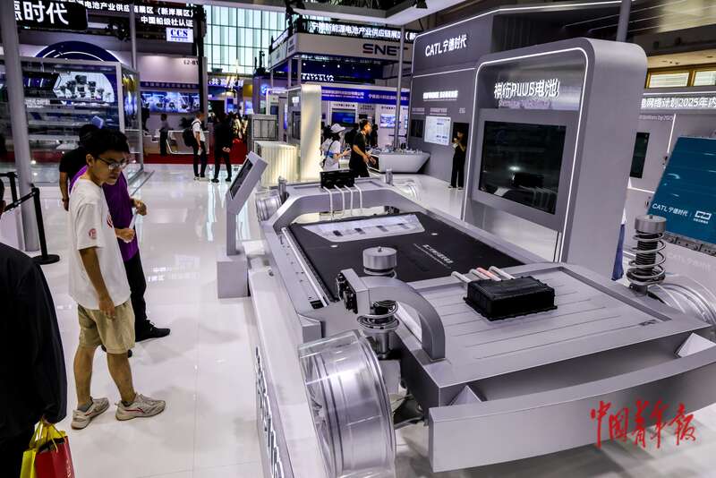 7月17日,北京,中国国际展览中心(顺义馆),第三届链博会智能汽车链展区,观众在一家新能源科技公司展台观看新能源汽车底盘电池模型。陈思阳/摄