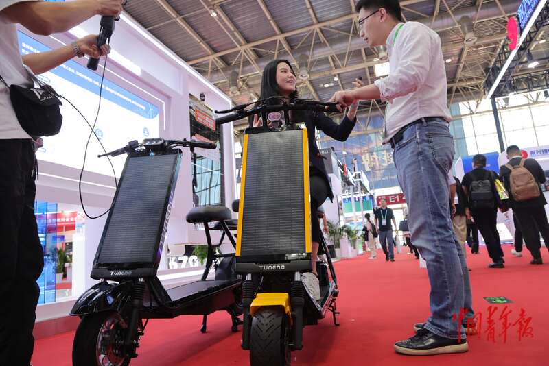 7月17日,北京,中国国际展览中心(顺义馆),第三届链博会清洁能源链展区,一名记者体验太阳能电动车,该款太阳能电动车储能续航约40km,光能续航每天最大可增加约20km,预计今年9月份上市,价格不超过4000元。陈思阳/摄