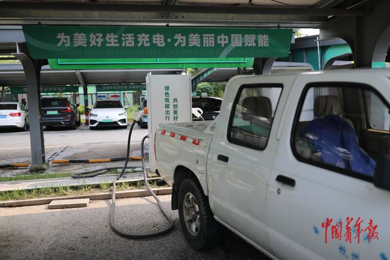 8月4日,浙江省杭州市萧山区瓜沥镇梅林村,光充储一体化停车场,一名村民正在充电桩前扫码购电。萧山区是汽车大区,据介绍,截至去年底,萧山新能源汽车占比近20%。随着充电桩需求的增加,梅林村建成了全区首个光充储一体化停车场,共设16个充电桩,车棚顶上安装了120千瓦光伏发电板,配置了30千瓦的储能。目前,这里经过两年的运营,全站日均充电量已经达到了1000度/天,村民的充电成本降低了近1/4,实现“新能源发的电,优先给新能源车用”的绿色循环。中青报·中青网记者 孔斯琪/摄