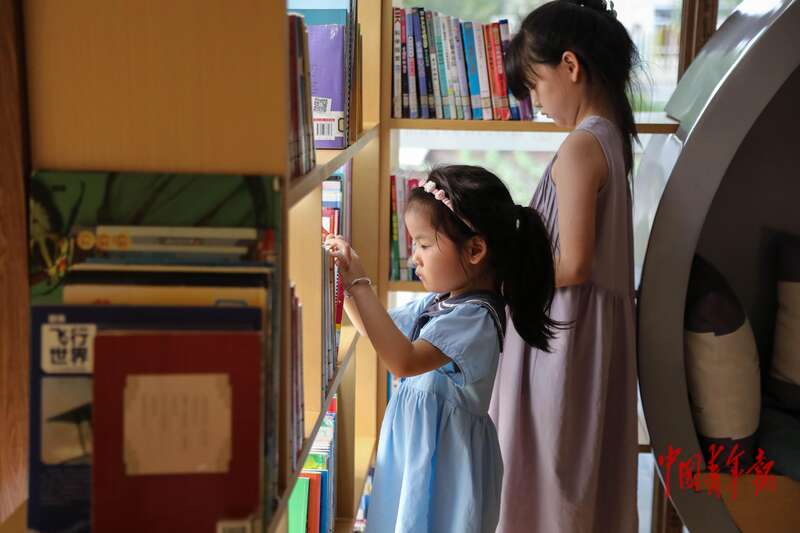 8月4日,浙江省杭州市萧山区瓜沥镇梅林村,两名小朋友在24小时乡村数字书房里选书。中青报·中青网记者 孔斯琪/摄