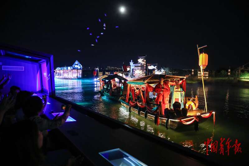 8月8日,浙江省绍兴市越城区,游客在船上欣赏讲述大禹治水故事的灯光秀。中青报·中青网记者 孔斯琪/摄