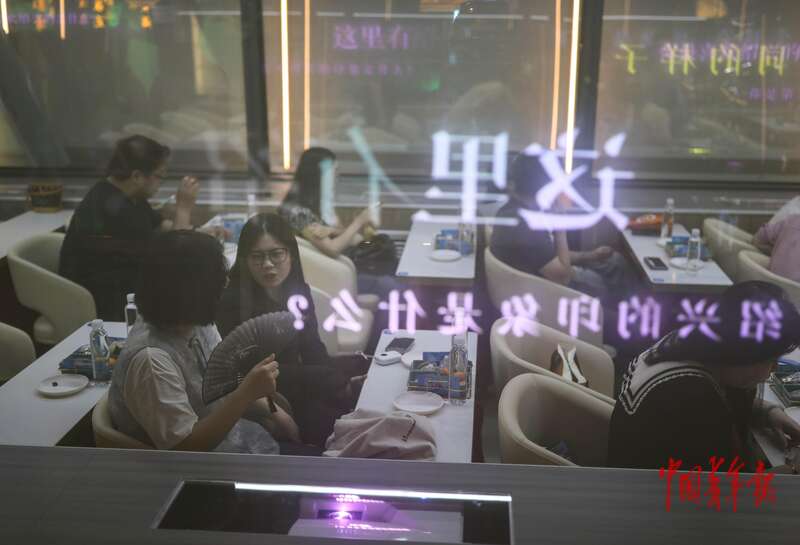 8月8日,浙江省绍兴市越城区,游客在“醉游长歌·寻梦绍兴水上游”游船上,船两侧的玻璃上映着有关绍兴文化历史的文字投影。据了解,这趟游船穿梭于浙东运河文化园和黄酒小镇间,于今年五一期间正式投入运营。在历史悠久的古运河上,游客可以乘船观看讲述绍兴历史典故、人文风情的水上交互漂流剧场,领略两岸城市风光,在在水幕与光影交织中,沉浸式观赏一幅穿越时空的文明画卷。