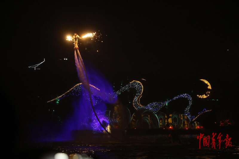 8月8日,浙江省绍兴市越城区,一名演员在进行水上焰火表演。中青报·中青网记者 孔斯琪/摄