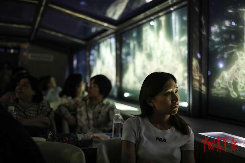 8月8日,浙江省绍兴市越城区,游客在游船上观看有关越地文化历史的动画投影。中青报·中青网记者 孔斯琪/摄