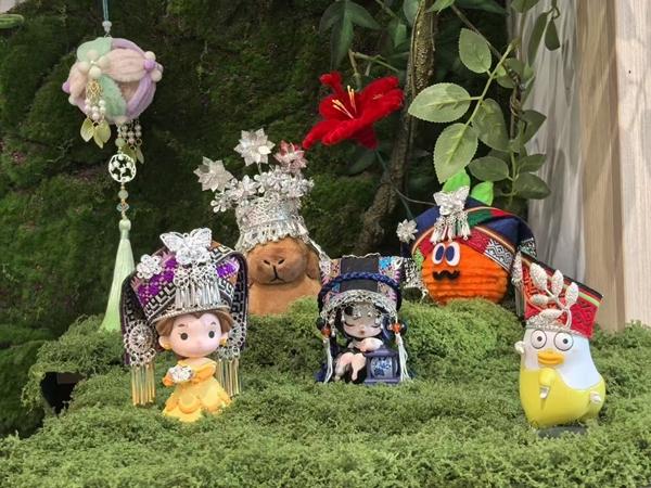 今年2月,“瓯骆工坊”开发新品,大家想到将花冠的造型与毛绒玩具结合,为一些小型玩偶做了苗族花冠的帽子,又为其创作了壮锦织带和花冠底托构成的壮族头饰。“我们的工作人员自发将娃娃带到店里做娃衣打样,我们就这样开发出了第一代娃帽产品。”籍颖绮说。