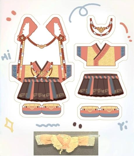 彭琬涵开始找寻这件衣服的详细资料,她先是浏览了敦煌马圈湾汉代烽燧遗址的考古简报,又询问了敦煌博物院,但信息都较少,最后还是通过行业内朋友的帮助,找到了《敦煌马圈湾汉代烽燧遗址发掘报告》,看到记载:“以素绢手工缝制,以深红色绢作领和袖,以深蓝色绢作袖缘。衣长4厘米……下摆残。”于是,她产生了一套完整娃衣的设计思路,并画了稿图——左襟压右襟的汉制交领,上襦长度控制在腰间;文物下裙虽残缺,但参考西汉平面裁剪技法,下裙延伸出垂坠裙摆,腰间褶皱与系带均按出土资料复原。颜色方面,她选用风化后的现存色,上襦为鹅黄色、橙红色和蓝绿色,下裙为深棕色。娃衣还增添了几种汉代经典纹样,并从汉代器物中提取出元素,做了一些原创设计。