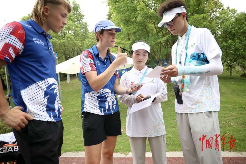 8月8日下午,成都世运会掷准飞盘比赛结束后,现场志愿者“小青椒”和英国运动员确认成绩。英国运动员Rachel Turton(左二)对“小青椒”的细致工作表示感谢。中青报·中青网记者 王鑫昕/摄
