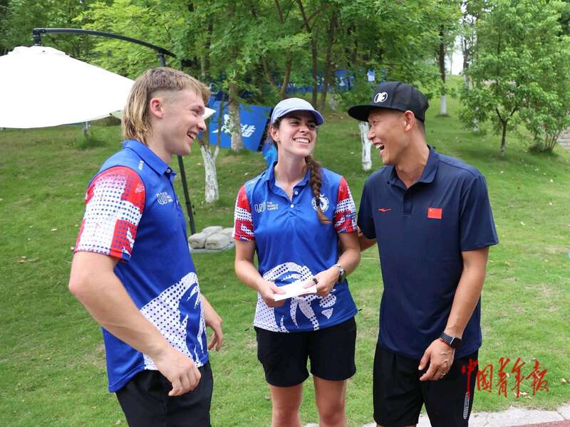 8月8日下午,成都世运会掷准飞盘比赛结束后,中国运动员赵辰菲(右一)教英国运动员说中文。中青报·中青网记者 王鑫昕/摄