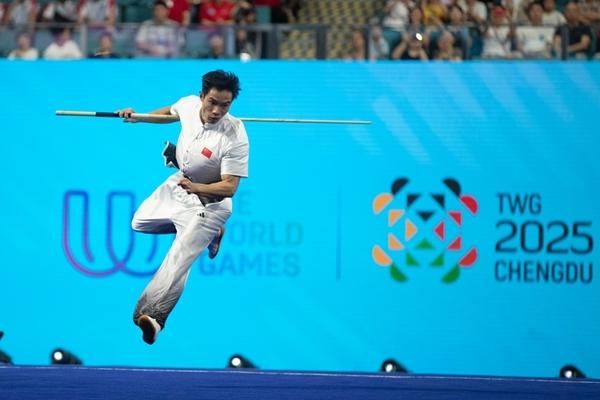 8月9日,代表中国参赛的四川籍选手高久尚夺得成都世运会武术项目套路男子长拳-刀术-棍术全能金牌,实现了他赛前“在家门口夺冠”的豪言。汪龙华/摄