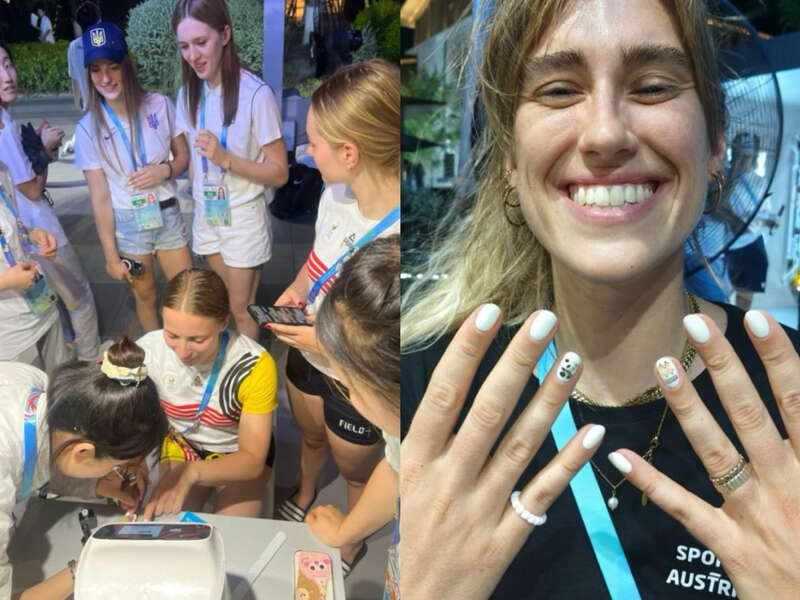 美甲机器人5秒喷绘出的世运会会徽与熊猫纹样,引得国外运动员前来体验。成都世运会执委会供图