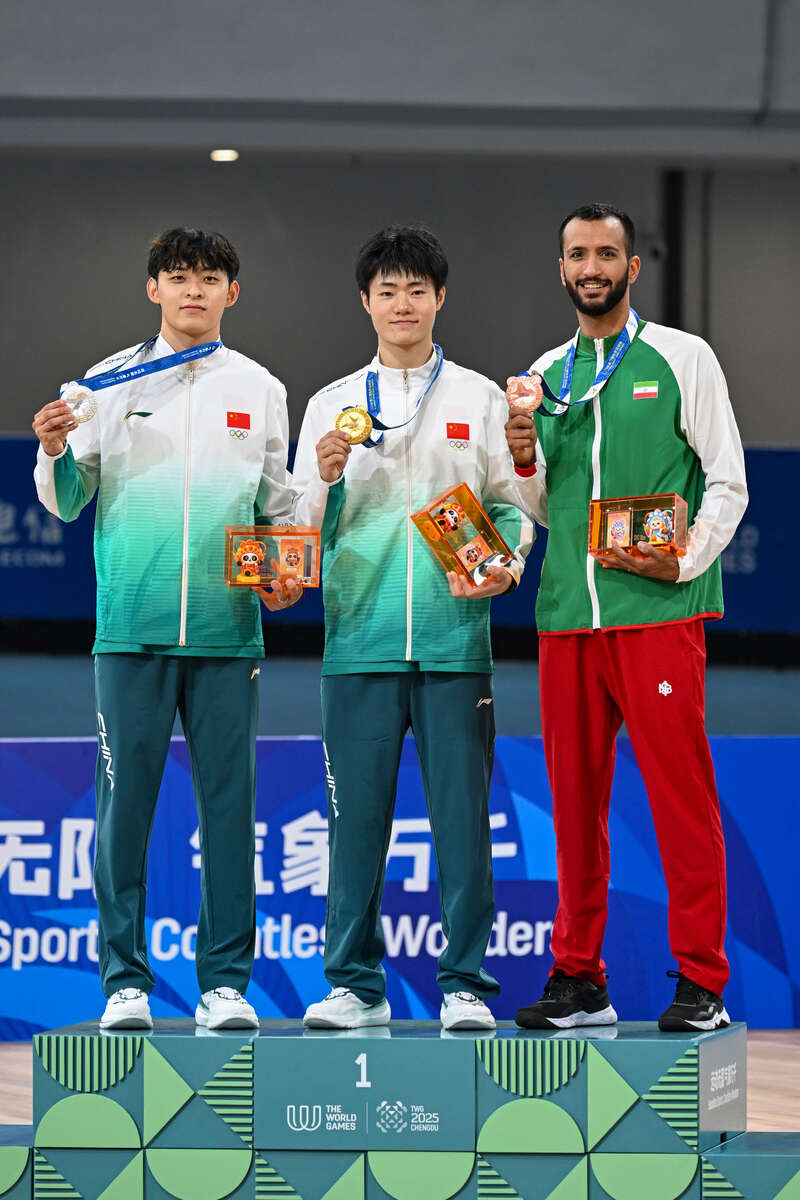 8月16日,亚军中国选手付裕、冠军中国选手张颢、季军伊朗选手莱萨尼(从左至右)在颁奖仪式上。新华社记者 谢剑飞/摄