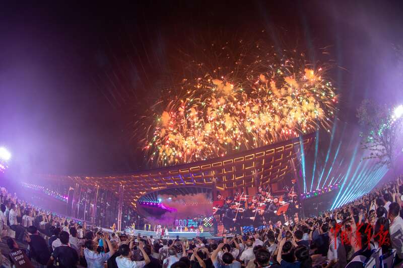 8月17日,成都世博园,成都世运会闭幕式,观众拍摄天空中燃放的焰火。汪龙华/摄
