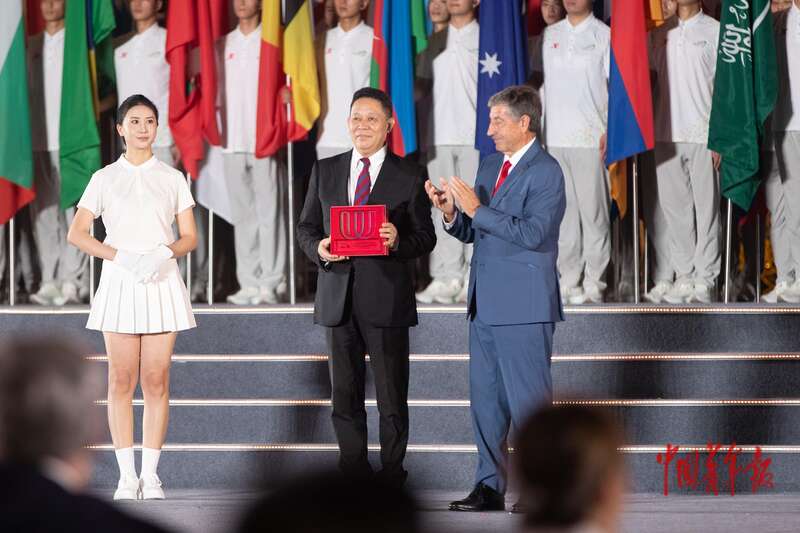 8月17日,成都世博园,成都世运会闭幕式,国际世界运动会协会主席何塞·佩鲁雷纳(右)、四川省副省长杨兴平(中)分别代表国际世运协与成都世运会主办方互赠礼物。汪龙华/摄