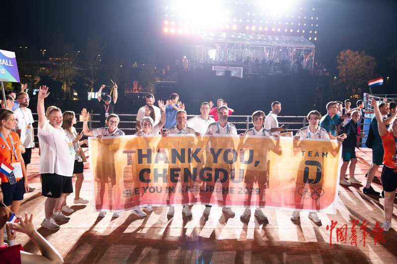 8月17日,成都世博园,成都世运会闭幕式上,来自德国的运动员打出“谢谢成都”和“2029年相会德国卡尔斯鲁厄”(备注:下一届世运会主办地)的横幅。汪龙华/摄