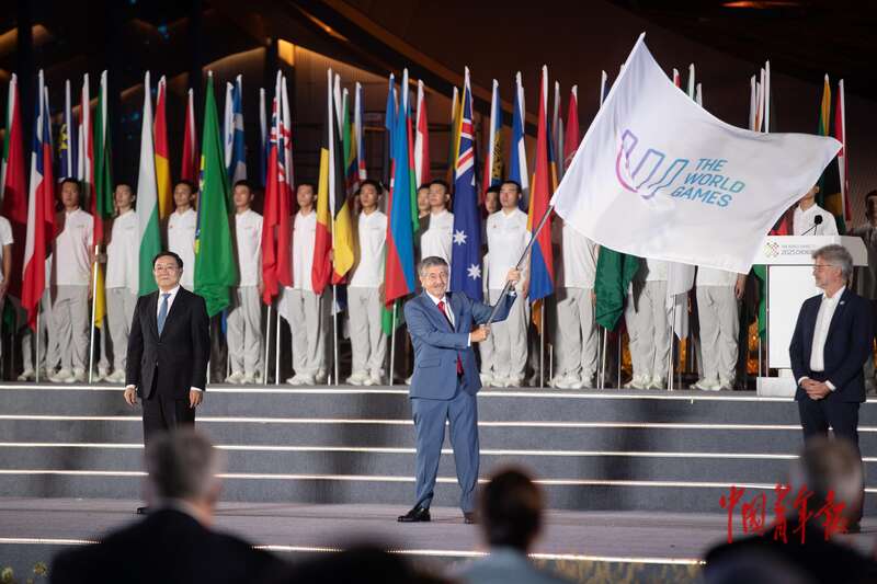 8月17日,成都世博园,成都世运会闭幕式,成都市市长王凤朝(左)将会旗交给国际世界运动会协会主席何塞·佩鲁雷纳(中),何塞·佩鲁雷纳将会旗交给德国卡尔斯鲁厄市市长弗兰克·门特鲁普。汪龙华/摄