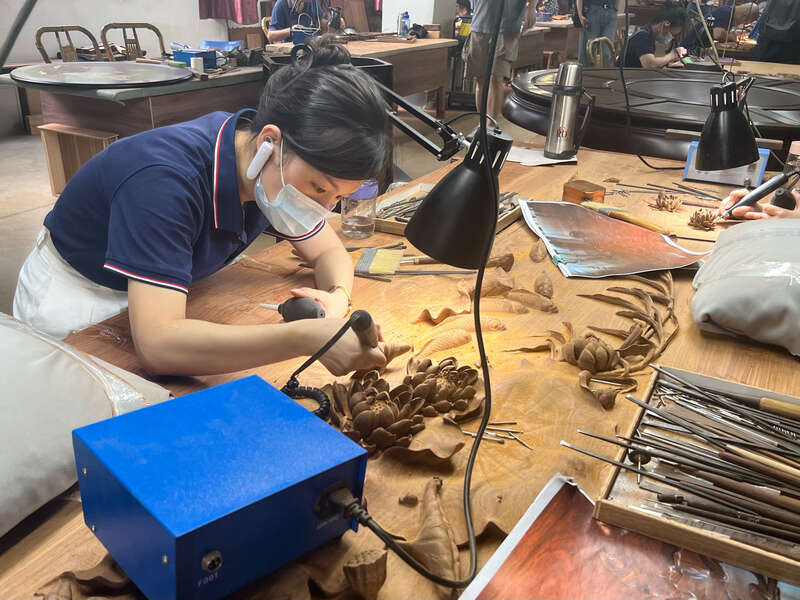 除此之外,三福工艺园也会接待研学团队,让他们了解并体验中国家具文化、雕刻艺术、榫卯结构以及香道文化等。