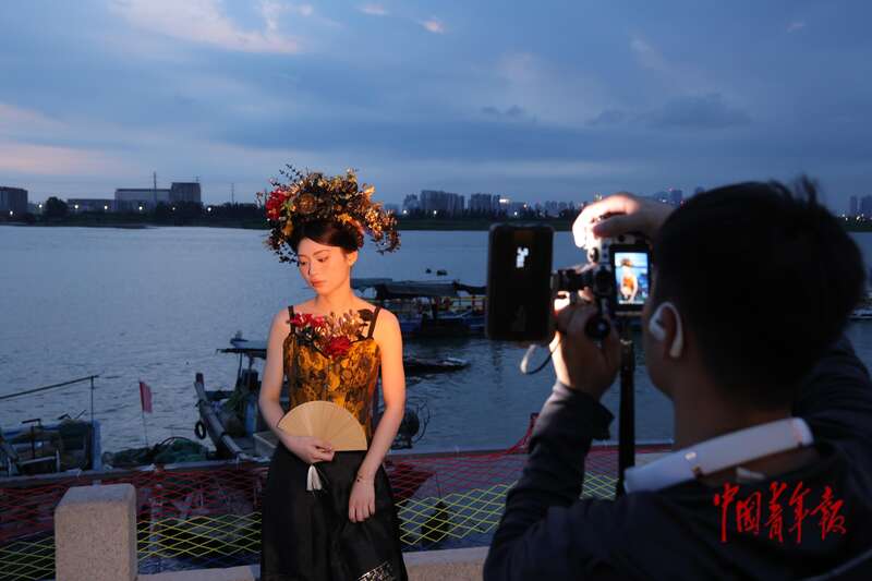 8月18日,福建省泉州市蟳埔民俗文化村,年轻人通过网络直播售卖簪花文创。中青报·中青网见习记者 陈思阳/摄