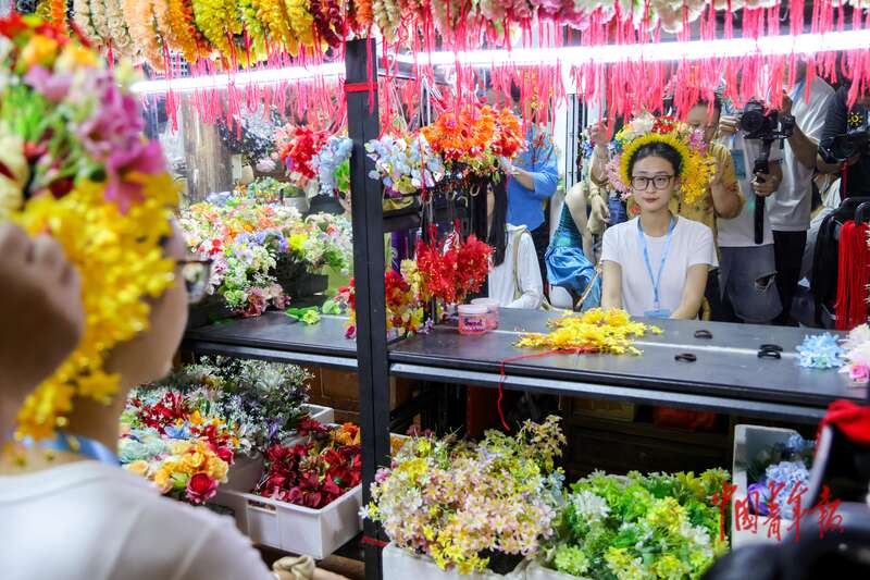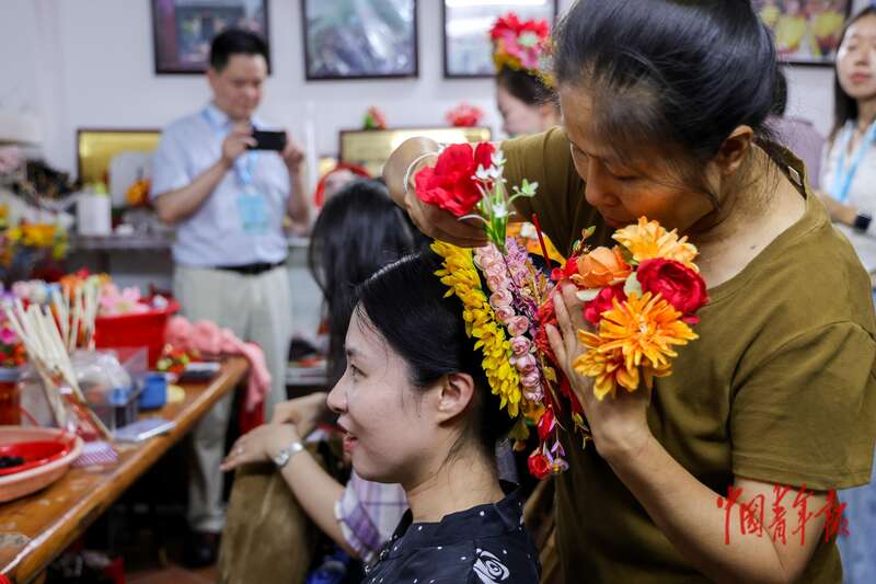 8月18日,福建省泉州市蟳埔民俗文化村,一家簪花店内,游客在体验国家级非遗“蟳埔女习俗”。中青报·中青网见习记者 陈思阳/摄